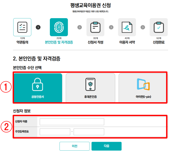 - 본인인증 방식 [공인인증서], [휴대폰], [아이핀(I-PIN] 중 1개 선택