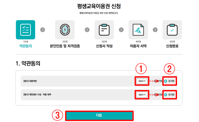 - 필수 항목의 모든 약관에 동의해야 [다음]을 클릭하여 신청 가능