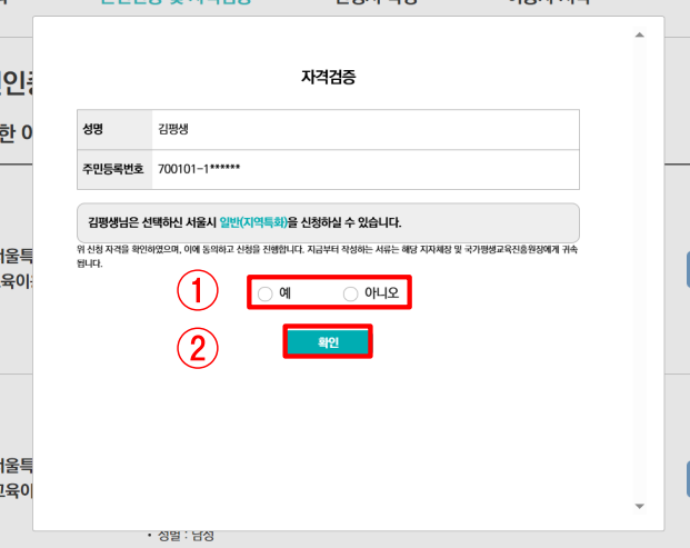 - 자격검증 결과 확인 후, "예"에 체크하시고 [확인]