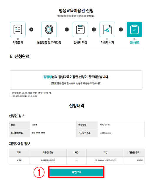 - 신청내역 확인 후 [메인으로] 클릭 하여 홈으로 이동